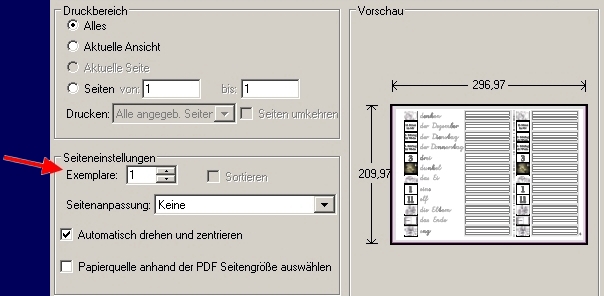 | 4. | Wenn Sie einen Klassensatz ausdrucken wollen, geben Sie bitte die Anzahl der Exemplare ein. Die Anzeige auf dem Bildschirm könnte dann etwa so aussehen: |