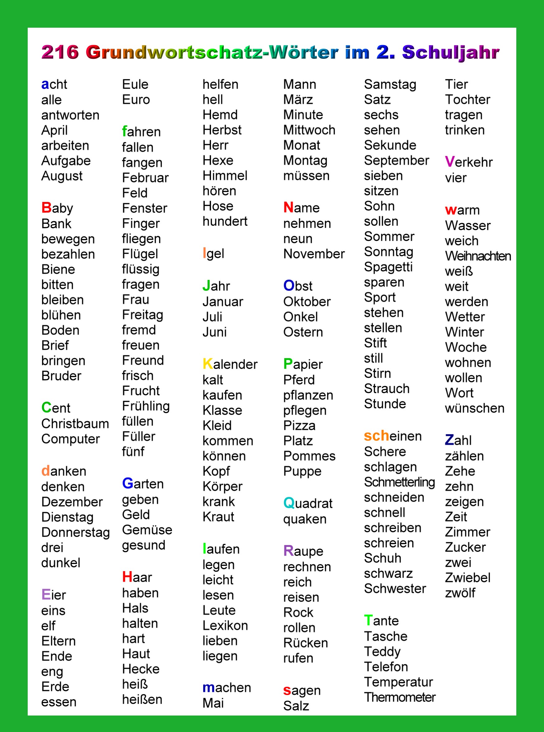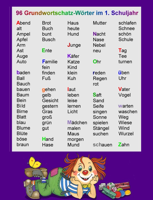 Hier sind alle vom Kultusministerium Bayern verbindlich gemachten Grundwort- schatzwörter aufgelistet. Auf die Rechtscheib-Kartei fürs erste Schuljahr wurden 96 Wörter, auf das zweite Schuljahr 216 Wörter verteilt.